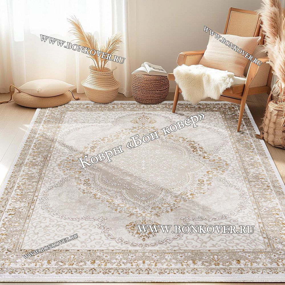 Изящный Турецкий Ковер Для Гостиной Медальон Дизайн 01 наполняет интерьер жилого пространства теплом и уютом, гармонично сочетает в себе изящество и красоту. Он соткан из экологически чистого сырья, прочный и долговечный.